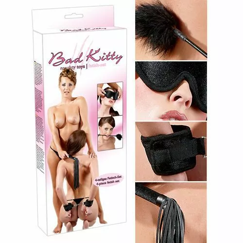 De 4 delige BDSM set van het merk Bad Kitty laat jou kennismaken met spannende bdsm spelletjes. De set bevat alles wat je nodig hebt: Een oogmasker, een paar handboeien met klittenbandsluiting en haken, een zweep met een lengte van 40 cm en een kietel-veer met een lengte van 30 cm.