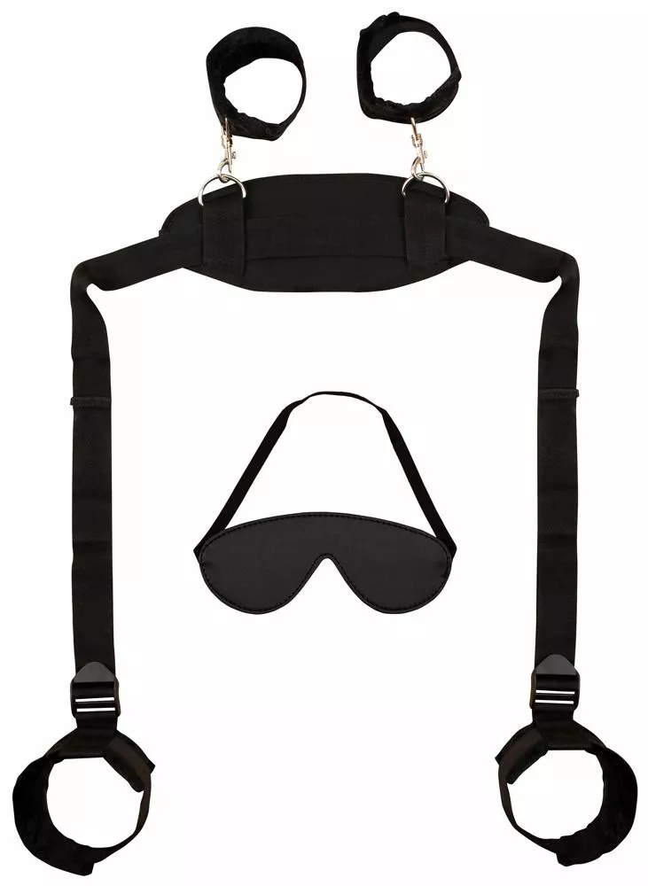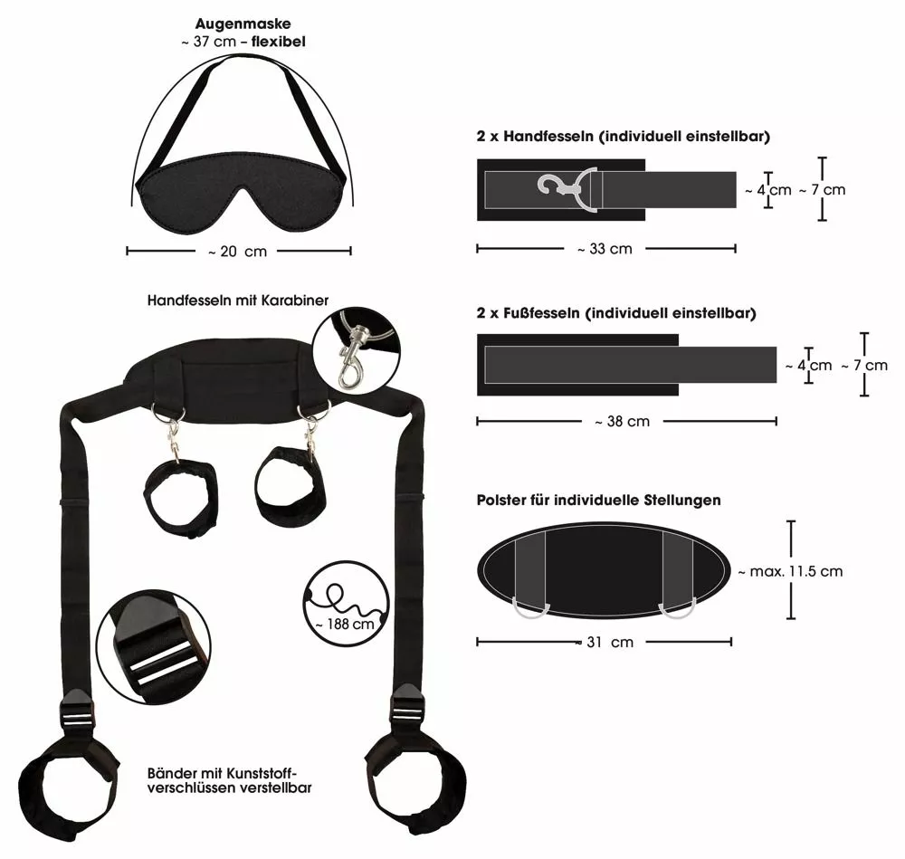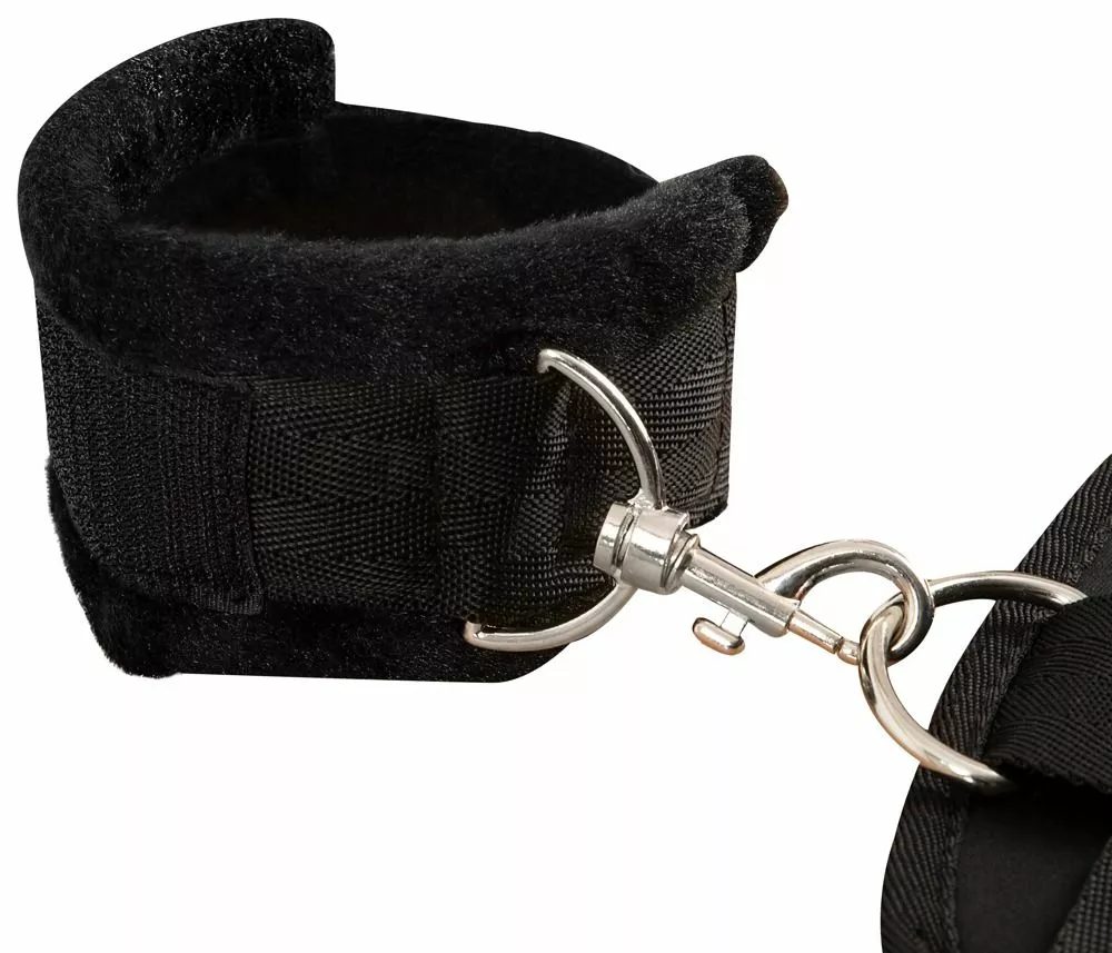 Deze BDSM Set Nek Hand Voet Bondage van Bad Kitty is een geweldige bondage set. De boeien zijn gevoerd met zacht pluche aan de binnenkant en verstelbaar met stevige klittenbandsluitingen voor een perfecte pasvorm. De riemen aan de enkelbanden zijn verstelbaar. De handboeien zijn afneembaar doormiddel karabijnhaken. De set bestaat uit nek, hand en voetboeien en een oogmasker.