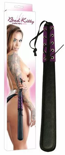 Leer je onderdaan discipline met deze paddle van Bad Kitty! Of eht nu een corrigerend tikje is of een harde mep, de straf bepaal je helemaal zelf. De greep is voorzien van een mooie lederen paarse bekleding en de rest is zwart leer.