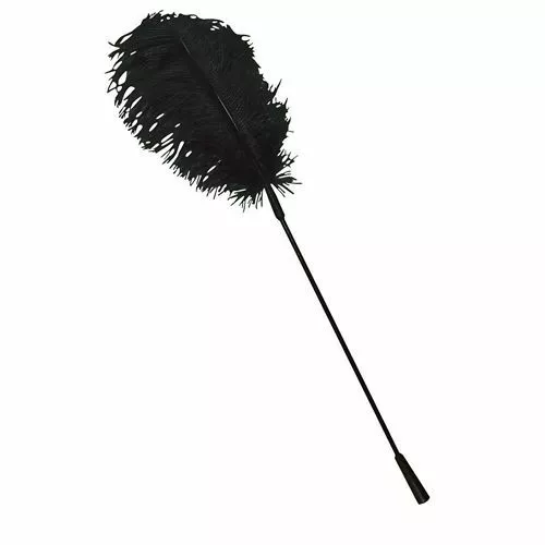 Lange zwarte veer (ca. 27 x 13 cm) op een plastic stok (lenge 38 cm).