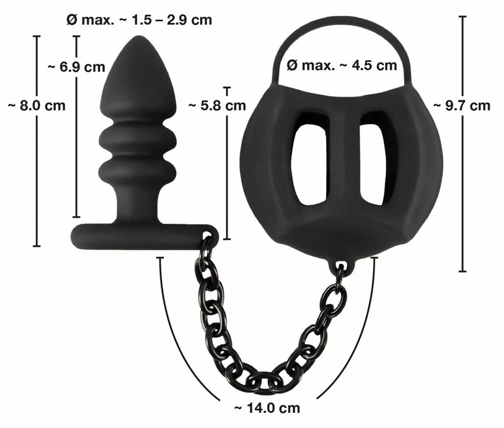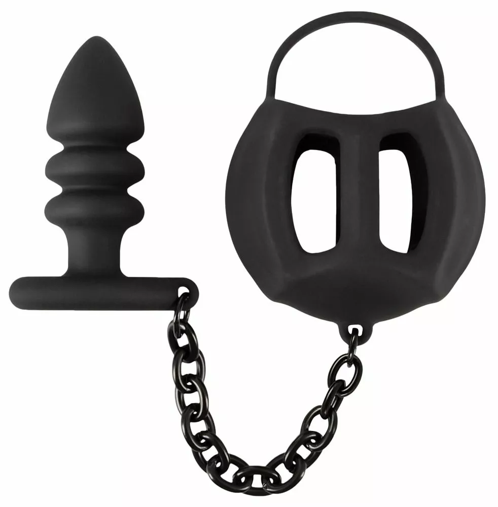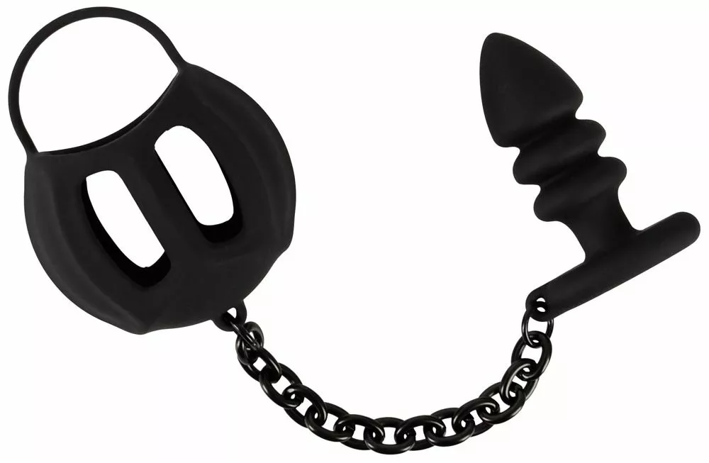 De rekbare cockring wordt over de penis geschoven en de testikels worden in de flexibele siliconen kooi geplaatst. De anaalplug wordt in de anus ingebracht. De verbindingsketting zorgt voor een geweldig gevoel en wrijft stimulerend over het perineum wanneer hij wordt gedragen.