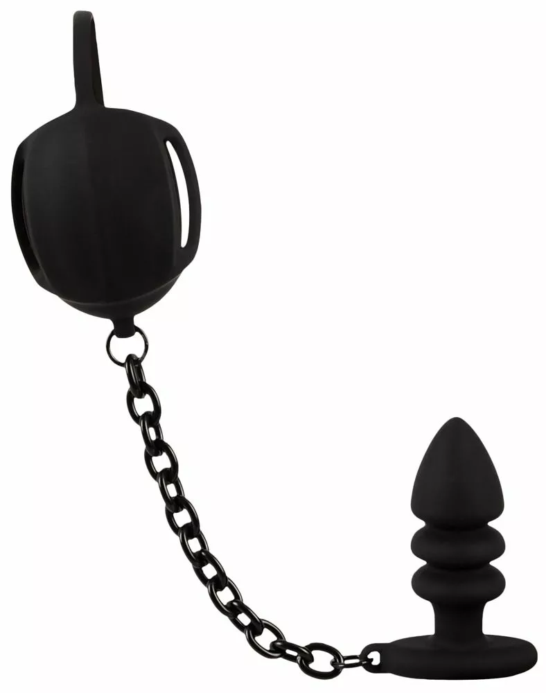 De Ball Cage met buttplug van Black Velvets is een penisring met een testikelkooi en verbindt deze via een robuuste ketting met de uitgesproken geribbelde anaalplug. Naast een heerlijk gevoel bij het dragen en een sterke uitstraling, biedt het ook een optimale ondersteuning voor de erectie.