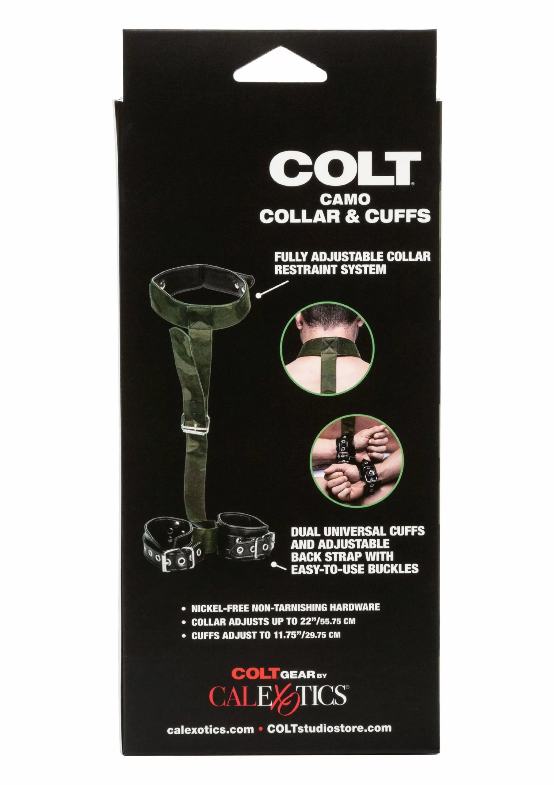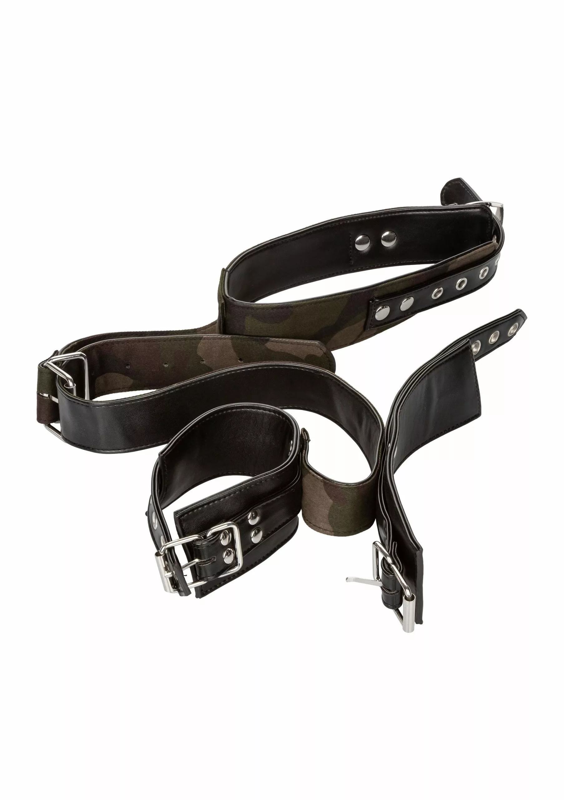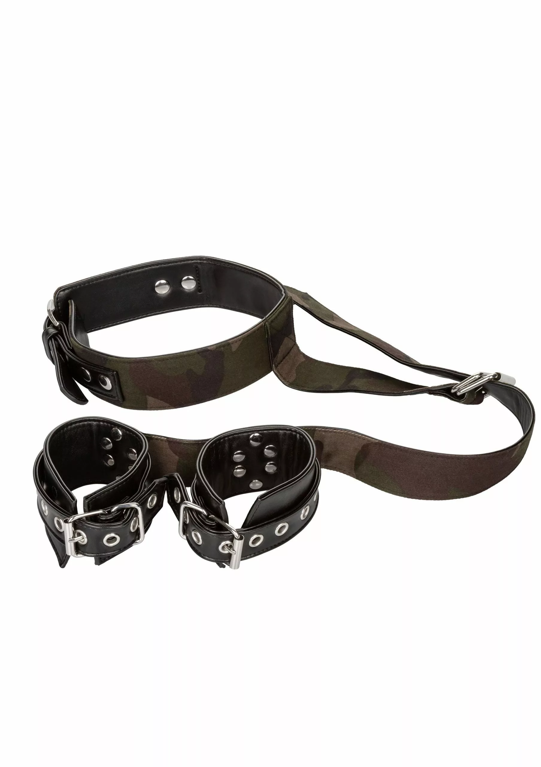 Met deze Halsband met Handboeien – Camouflage bind jij je partner vast tijdens een kinky bdsm avondje. De set bestaat uit een brede halsband die jij kan verstellen met een gesp en een set handboeien verstelbaar met een gesp. Jij kan de halsband en handboeien apart van elkaar gebruiken. Maar wanneer jij ze samen gebruikt bind jij de polsen van je partner samen achter de rug. Ook de hoogte is verstelbaar. De binnenkant van de Halsband met Handboeien – Camouflage is zacht en snijdt niet in je huid. De set heeft een store camouflage print voor een coole look.