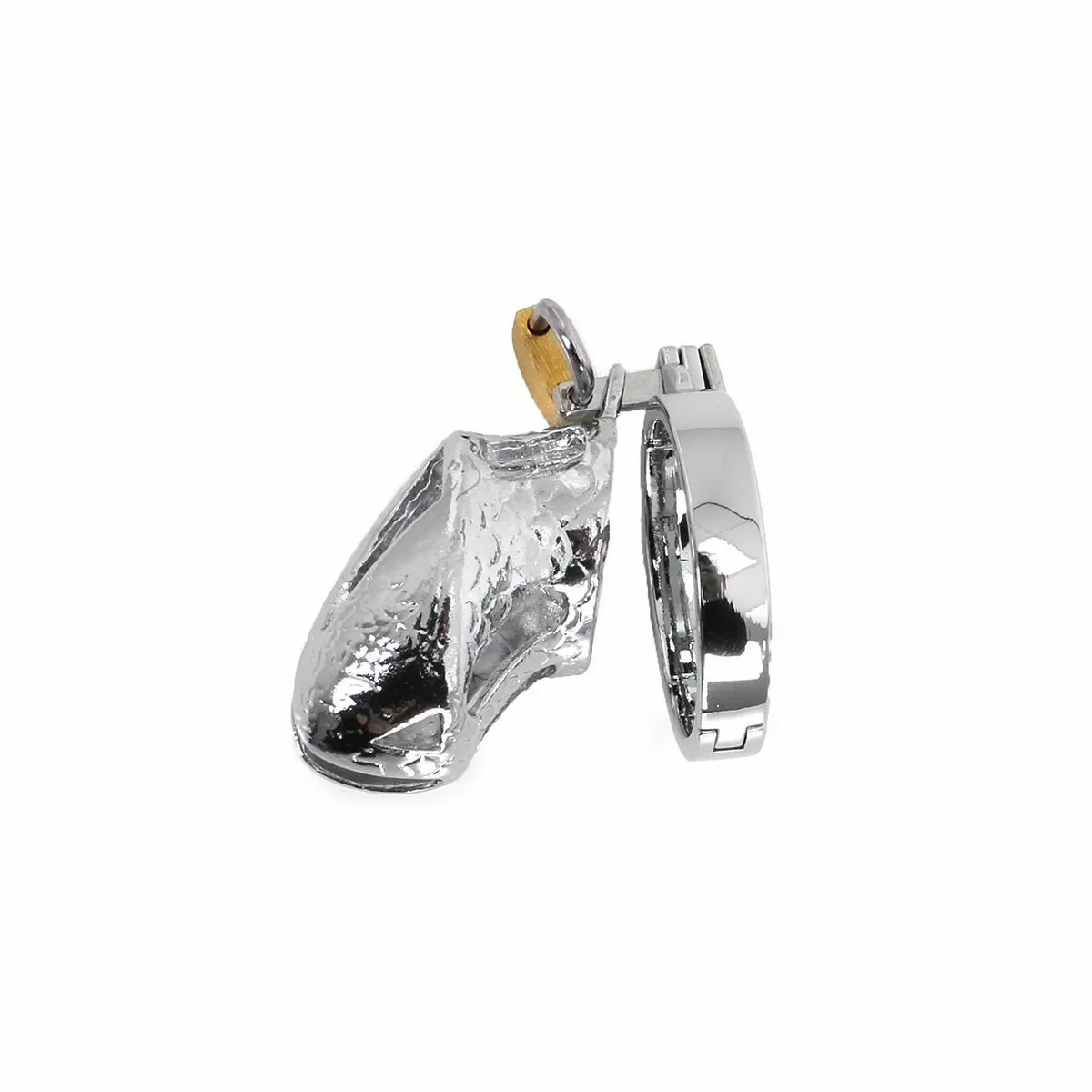 Heeft jouw stoute slaaf teveel vrijheid? Houdt je slaaf dan achter slot en grendel met deze échte metalen kuisheidskooi. Sluit je slaafje op en dwing hem zich over te geven door de kooi en de ring over de penisschacht te plaatsen zodat hij geen kant op kan. Wanneer dit is gebeurd, begint het spel pas echt. Met zijn mannelijkheid opgesloten in een fort van metaal, zal hij geen volledige erectie kunnen krijgen. Dat betekent dat zijn bevrediging en stimulatie beperkt zijn gedurende de tijd dat je hem beperkt houdt. Lang leve dominantie! De ring is 45 mm en de ingang is 32 mm voor de penis.
