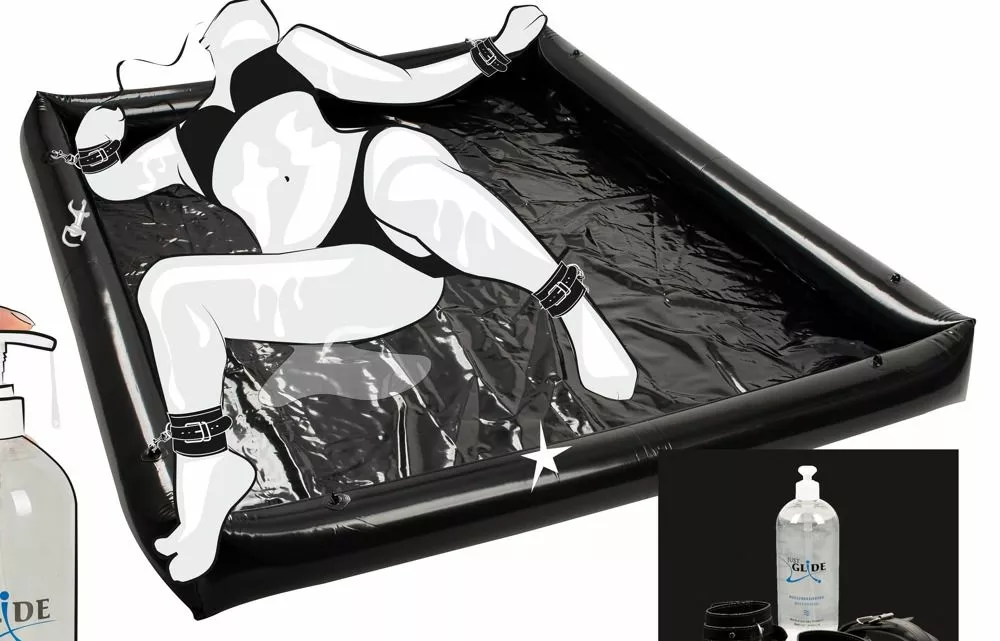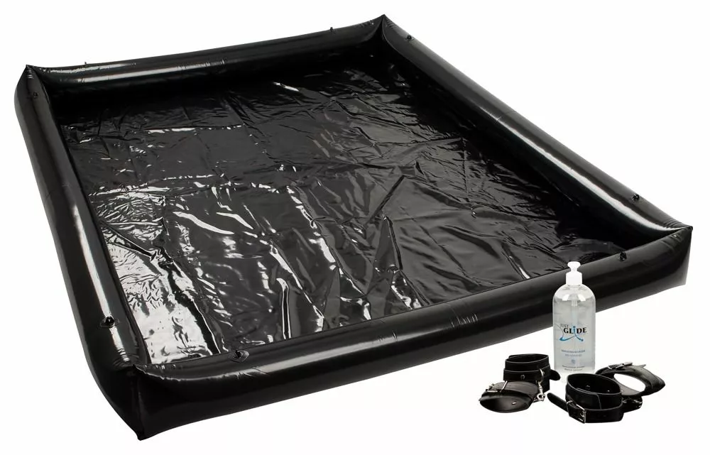 De Laken Glossy Games van Fetish Collection is een complete set. Het laken heeft een opblaasbare rand van 15 cm die je overal kunt gebruiken. Hij is geweldig voor natte, vette en glibberige spelletjes. Ook heeft deze prachtige set hand en voetboeien die worden bevestigd met karabijnhaken.