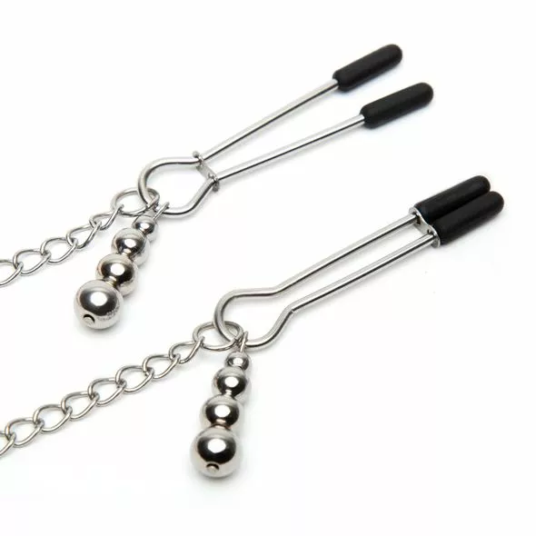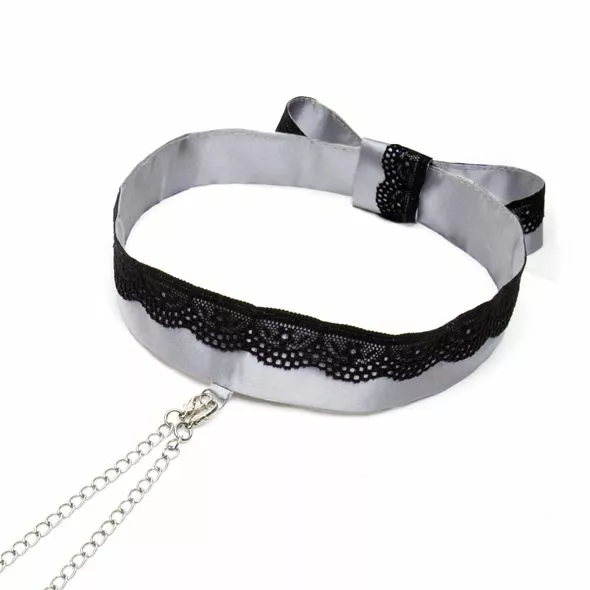 De halsband is gemaakt van zacht satijn, voor meer comfort en langdurig dragen. Met een snelsluiting aan de karabijn worden twee verstelbare tepelklemmen met siliconen uiteinden vastgemaakt. Schuif de metalen ring eenvoudig omhoog of omlaag om de tepelklem zachter of harder vast te zetten.