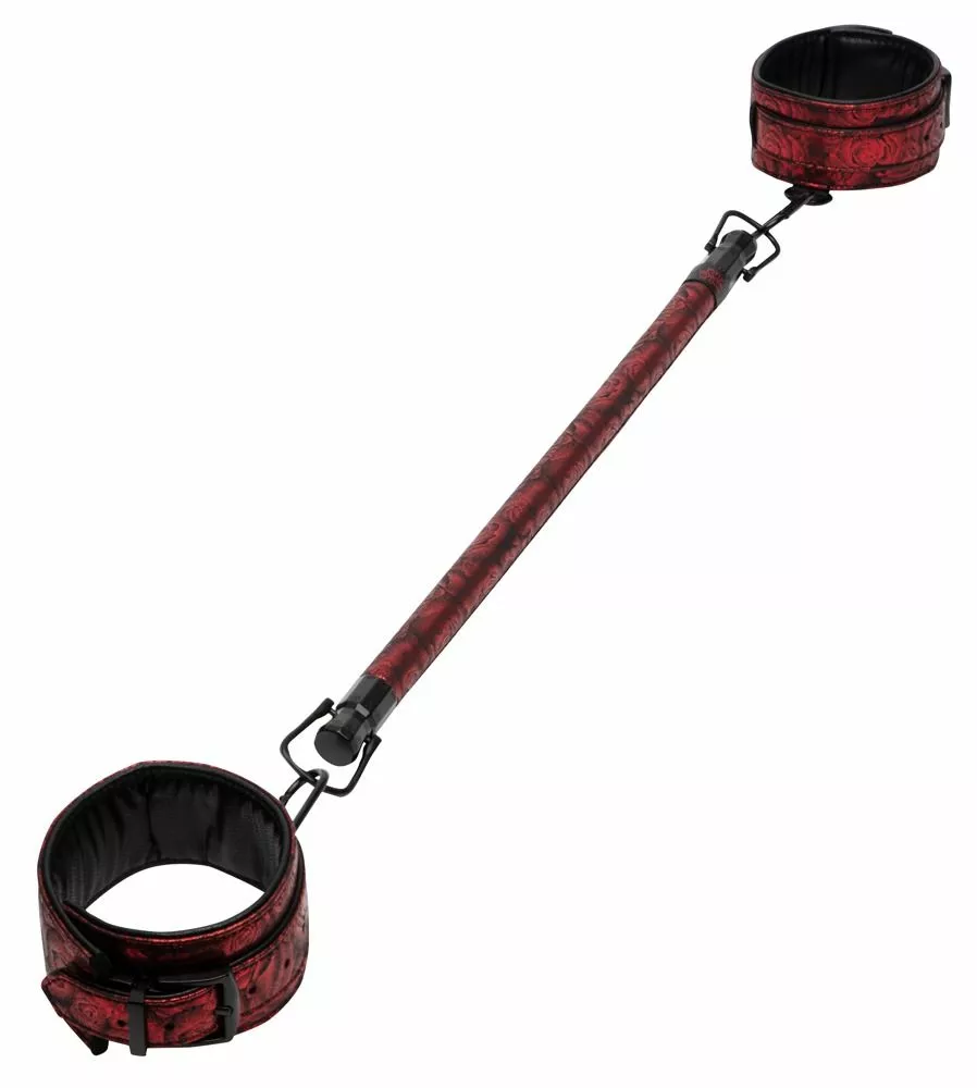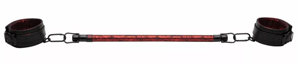 Verrijk je liefdes spel met de Sweet Anticipation Spreader Bar met Boeien van het bekende merk Fifty Shades of Grey. Deze spreader bar biedt lustvolle fixaties voor je lover zijn/haar handen of voeten. De hand- of voetboeien worden met clipkarabijnhaken aan de D-ringen aan het uiteinde van de stevige stang gehaakt, die is omhuld met zacht geweven materiaal in een sensueel rozendessin. De comfortabel gevoerde manchetten kunnen aan beide zijden worden gedragen namelijk als een zwarte lederlook of satijn in zwart/rood rozendessin. Maak de set passend bij je lover door middel van de gespsluiting.