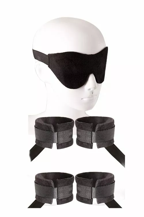 Inhoud Beginners Kit: set handboeien, set enkelboeien (beide met klittenbandsluiting) en een blinddoek.