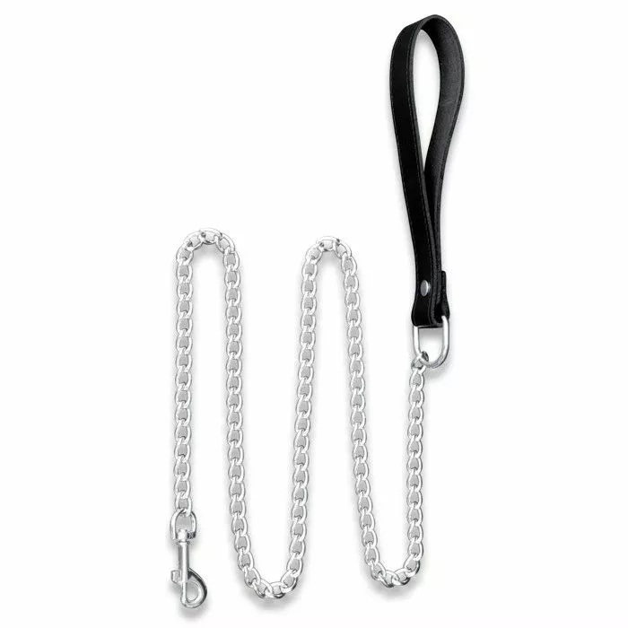 Prachtige stalen hondenriem met karabijnhaak en zwart leren handvat. Het design is simpel en strak. Met deze riem heb je jouw sub altijd onder controle. Zoek er wel even een mooie halsband of choker bij uit…. Anders ontsnapt je sub misschien toch nog, en dat is niet de bedoeling natuurlijk.