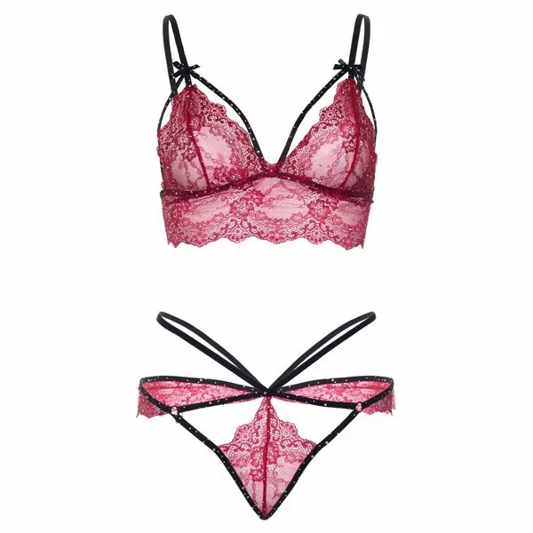 De Glitter Bralette en G-String – Bordeaux van Leg Avenue bestaat uit een bralette bh en G-string, beiden gemaakt van prachtige bloemen kant. Het bloemen kant schijnt sexy door en is versierd met schitterende strass steentjes.