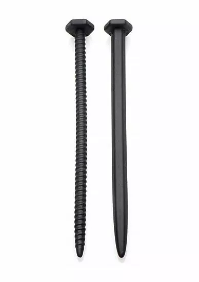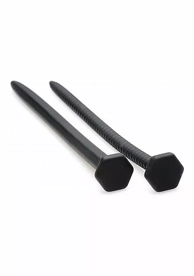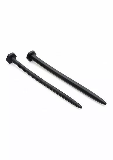 Deze siliconen sounds in spijker en schroef vorm uit de Master Series collectie zijn de ultieme accessoires voor bdsm liefhebbers. Geniet van het sensationele gevoel van penetratie van je urinebuis met deze kinky spijker en schroef dilators. Deze penis pluggen zijn ideaal geschikt voor de beginnende gebruiker. Ga jij voor de gladde spijker of geribbelde schroef? Beide sounds hebben een lengte van 15 cm en een diameter van 0,8 mm. De vlakke basis zorgt ervoor dat ze op de juiste plek blijven zitten. De siliconen sounds zijn buigzaam en voelen comfortabel aan. Verleg je grenzen ontdek hoe diep jij kunt gaan met deze kinky penis pluggen.