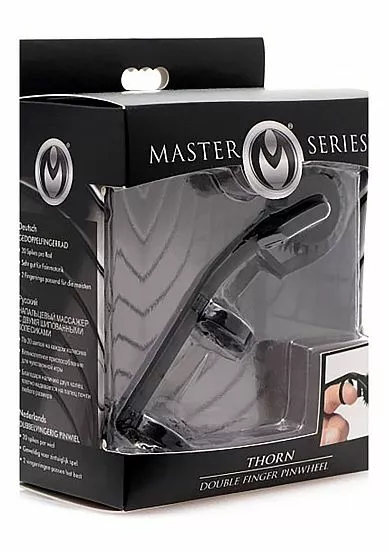 Word één met je spannende bdsm spel wanneer je deze Thorn Double vinger pinwheel draagt. De Thorn Double pinwheel is voorzien van 1 wiel en kan zowel door beginners als gevorderde gebruikers van bdsm accessoires gebruikt worden. Plaats je wijsvinger door de daarvoor bestemde openingen en zorg voor opwindende sensaties bij je partner door zijn of haar huid te prikkelen. Je kunt de pinwheel op elk gewenst lichaamsdeel gebuiken. Ontdek hoe dun de lijn tussen pijn en genot is en laat al jullie spannende fantasieën tot leven komen. Thorn Double heeft een lengte van 20.30 cm en heeft in totaal wel 20 spikes! Ga jij voor een sensationele prikkeling of voor een intense straf?