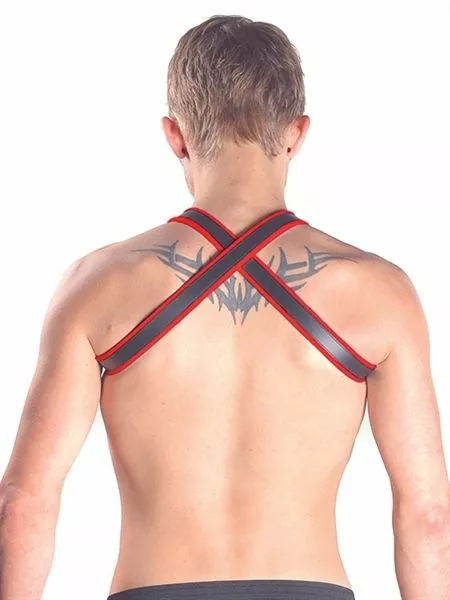 Dit mooie harnas van het gewelidge merk Mister B is gemaakt van hoogwaardig duurzaam leer welke een leven lang mee zal gaan. Het harnas is verkrijgbaar in twee maten, S/M en L/XL zodat jij de juiste pasvorm zal hebben. Het harnas is gemaakt van zwart leer met rondom een rode bies voor een geweldige look. Hij eindigt boven de borst en is voorzien van 2 O-ringen en diverse studs op het zwarte leer voor een geweldig stoere uitstraling. Op de rug is het harnas kruislings gevormd wat je rug prachtig uit zal laten komen.