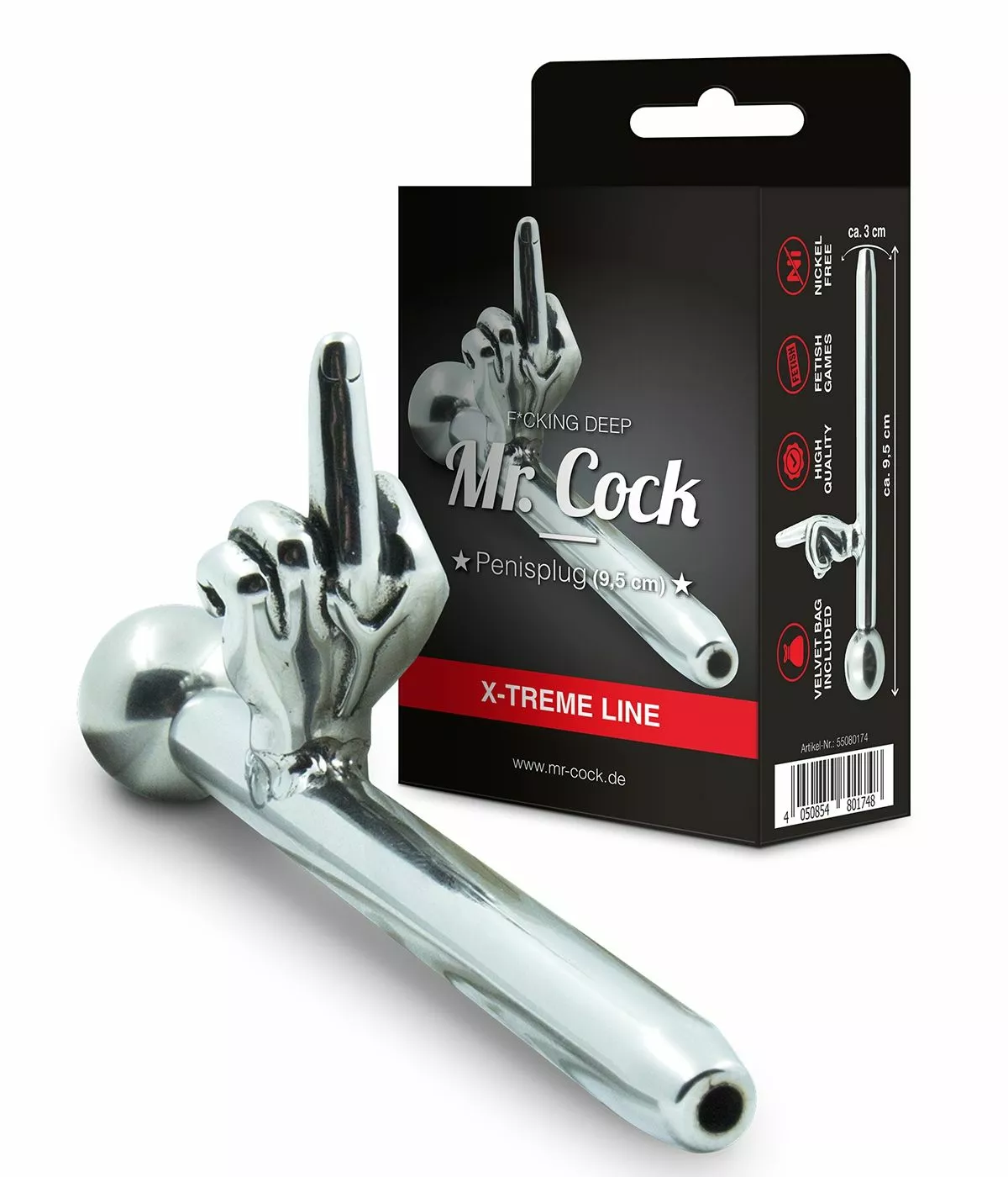 De Mr. Cock Penisplug Extreme Line Middelvinger van Mr. Cock is een penisplug die jij gebruikt voor het penetreren van je plasbuis. Deze fetish wordt steeds populairder onder de mannen. Deze penisplug is voorzien van een middelvinger voor een stoere look. De penisplug is van hoge kwaliteit en is nikkel vrij. De plug wordt gelverd inclusief opbergzakje om je penis plug in op te bergen.