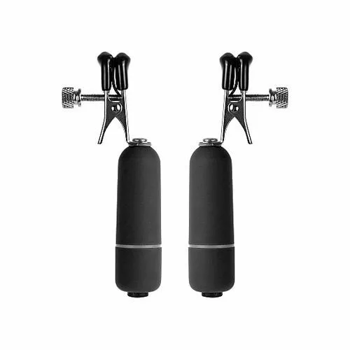 Stel je voor hoe jouw gevoelige tepels niet alleen maar worden verwend door de subtiele genotvolle pijn van een tepelklem, maar daarbij ook nog worden gestimuleerd door intense trillingen! Aan deze tepelklemmen is een zwarte vibratie-bullet bevestigd.
