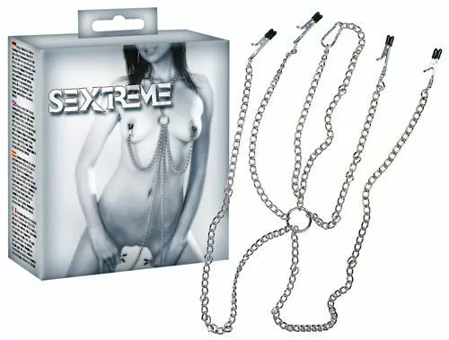 Deze robuuste tepel en schaamlip klemmen in één zijn een musthave voor ieder SM fanaat! Robuust gareel van zilverkleurig metaal. De halsketting loopt uiteen naar een borstring die vervolgens verdeeld wordt over twee tepelklemmen en vaginaklemmen.