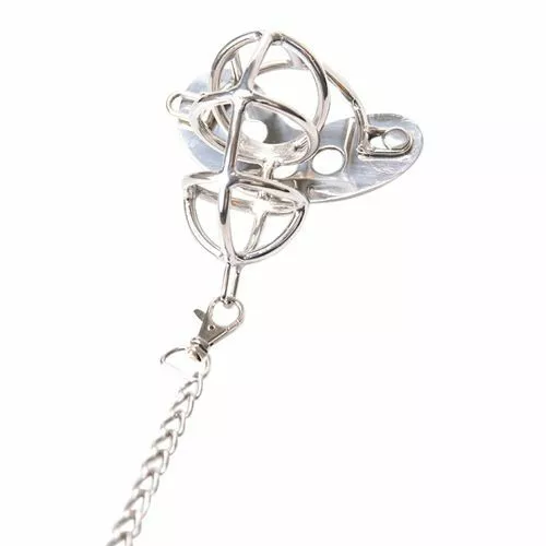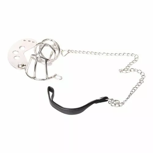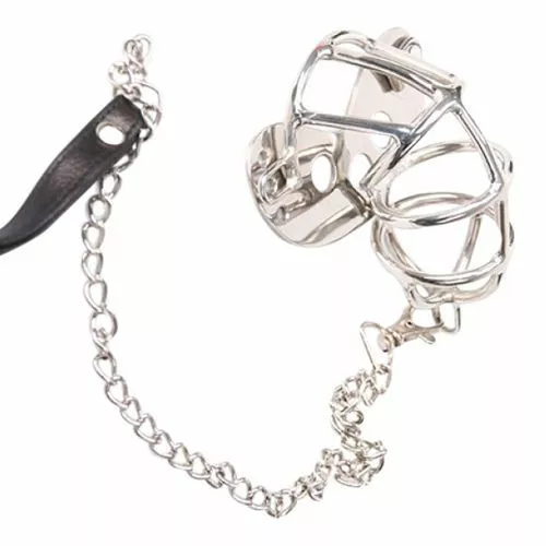 Stalen kuisheidskooi met ketting er aan bevestigd. Geniet van de onderdanige positie wanneer de penis ingesloten is in een kooi.Tegelijkertijd kan je partner jou aan de ketting overal naartoe dirigeren! Geniet samen van deze kuisheidskooi en maak jullie sessies extra spannend.
