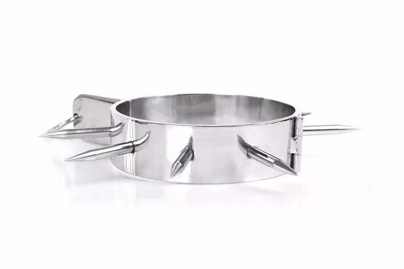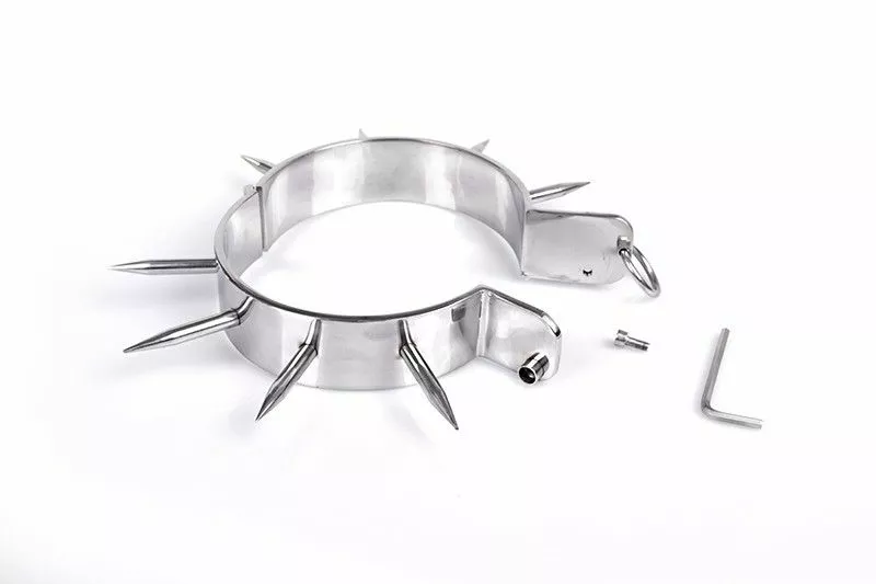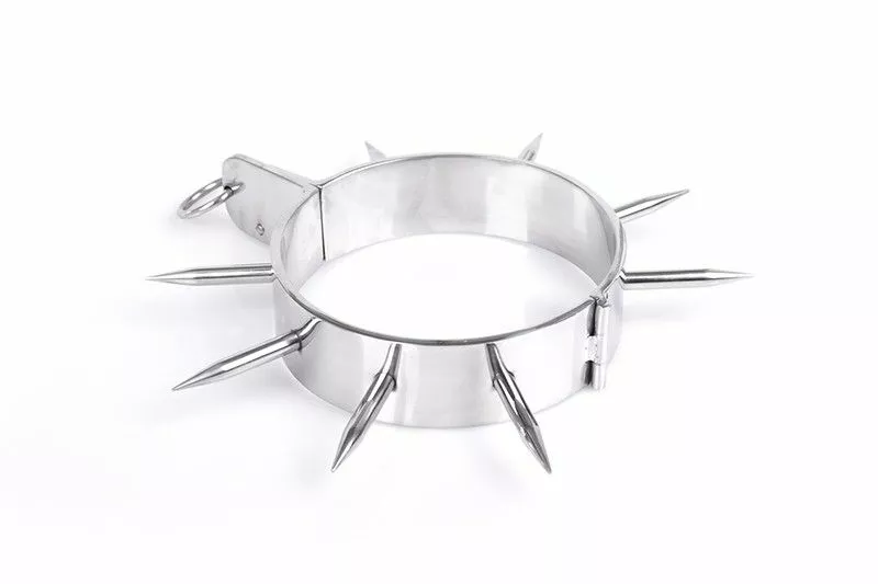 Zie er extra ruig en uitdagend uit met deze metalen halsband met grote spikes. Door de stekels die op deze halsband zitten zie je er erg ondeugend en verleidelijk gevaarlijk uit. De halsband is tevens voorzien van een ring waar een riem of touw aan vast gemaakt kan worden. Deze halsband maakt jouw BDSM (rollen)spel nog spannender!