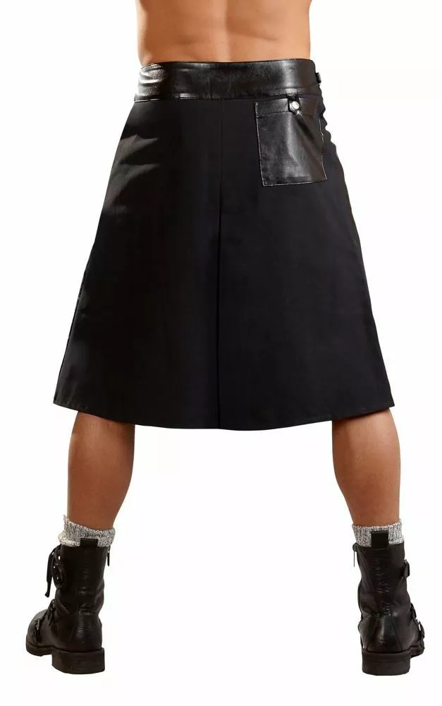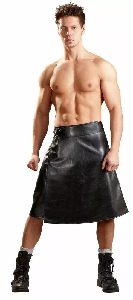 Deze stoere kilt is een ware eyecatcher. De kilt heeft een brede tailleband en wikkel voorkant van kunstleer en aan de achterkant van katoen met daarop een kunstleren kontzak met drukknoop. Op de heup is de kilt voorzien van een metalen sluiting, zodat de kilt niet open valt en maar goed ook want onder een kilt hoor je natuurlijk niets aan te hebben. Draag dit bijzondere item naar een feest en je zult zeker niet ongezien gaan.