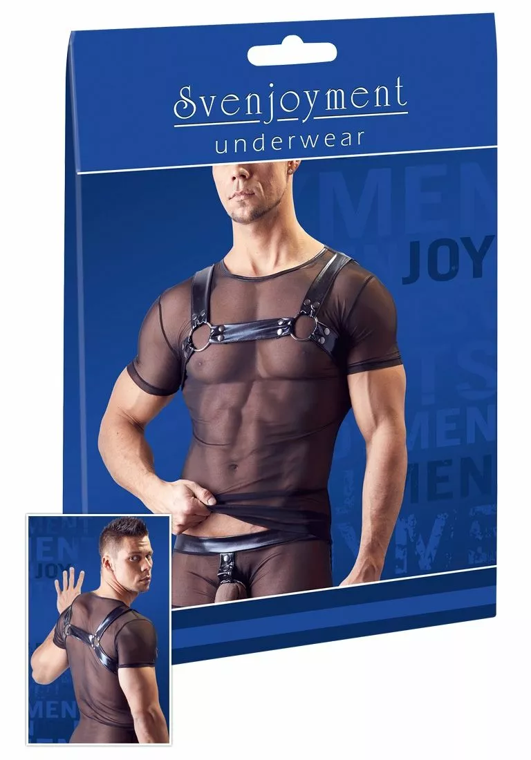 Dit sexy shirt bestaat uit een transparant netstof met borst harnas in wetlook. Het harnas loopt over de schouders en verticaal onder de oksels door, waar de verbindingspunten in de vorm van ringen te vinden is.