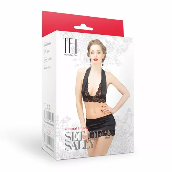 Een sexy halter top en een lekker strak mini rokje. De perfecte combinatie voor een avond vol passie! De Sally Set – Zwart komt uit de collectie van TET Lingerie. De top en het rokje zijn beiden gemaakt van hoogwaardige materialen. Het glanzende satijn en het bloemen kant geven samen een charmante look.