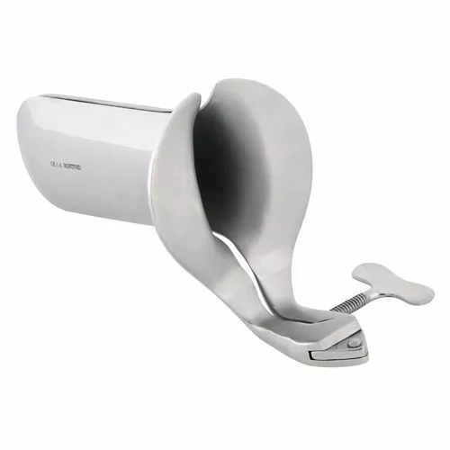 De speculum is gemaakt van roestvrij staal en wordt geopend en vastgezet met een stelschroef.