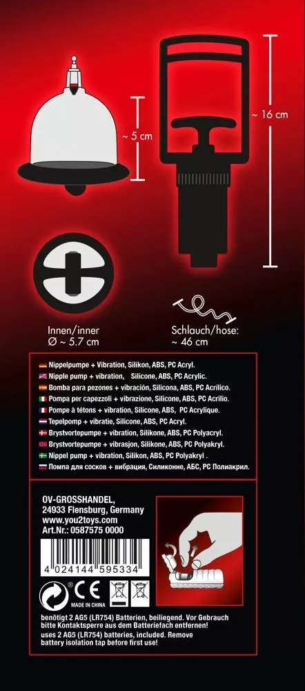 Deze Tepelcups hebben de mogelijkheid om heerlijk je tepels naar voren te trekken terwijl je ze ook nog eens verwent met heerlijke trillende vibraties. Verbind de pomp met een van de cups en zet de bullet alvast aan. Plaats de cup over 1 van de borsten en pomp tot jij het gewenste effect hebt bereikt. Verwijder nu de pomp, De cup behoud automatisch het vacuum, en herhaal alles met de andere borst. Wanneer jij de cup wilt verwijderen druk jij de rode pin in en je kan de cup snel en eenvoudig verwijderen. De tepelzuigers zijn ook zonder de bullets te gebruiken. De handpomp is 16.00 cm lang en de slang is 46.00 cm lang zodat jij alle bereik hebt om het geheel effectief te gebruiken.