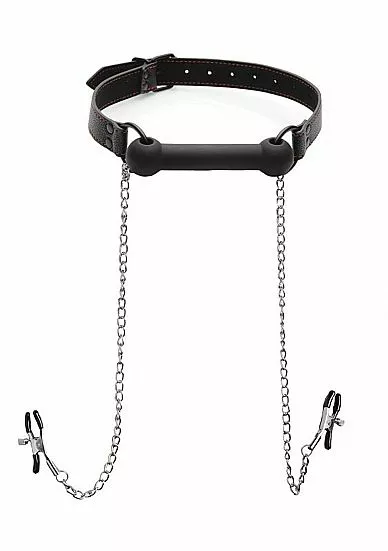 Ga een lange kinky nacht tegemoet met deze siliconen bit gag met tepelklemmen van het merk XR Brands! Deze kinky accessoire is geschikt voor bdsm liefhebbers en ieder ander die het wat spannender wil maken in de slaapkamer. De bit gag zorgt ervoor dat de mond van je partner of sub gesnoerd wordt en hij of zij niks tegen jouw snode plannetjes in kan brengen. De bit gag maak je makkelijk vast met de leren verstelbare band in de nek. Vanaf deze bit gag lopen 2 zilveren kettingen met daaraan 2 tepelklemmen naar beneden. Het uiteinde van deze kinky tepelklemmen is gemaakt van siliconen zodat ze prettig zijn om te dragen zijn. Geef je over en geniet van het opwindende gevoel van macht en onmacht!