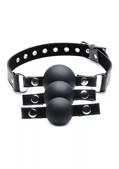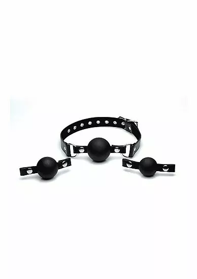 Deze verwisselbare siliconen ball gag set van XR Brands is de ideale toy voor bdsm liefhebbers. Snoer je sub de mond door hem of haar deze ball gag te laten dragen en hij of zij kan jou niet meer tegenspreken wanneer je al je ondeugende plannen uitvoert. Deze ball gag set is voorzien van 3 verwisselbare siliconen ballen in 3 verschillende maten: Maat S (3.80 cm), Maat M (4.30 cm) en Maat L (5.10 cm). Deze verschillende ballen en maten zijn ideaal wanneer je langzaam steeds een stapje verder wilt gaan, maar is ook perfect te gebruiken wanneer je met meerdere mensen speelt en je geen zin hebt om tussendoor de bal steeds te moeten reinigen. Het riempje is gemaakt van soepel kunstleer en is in maat verstelbaar. Hierdoor is hij prettig om te dragen en heeft hij een goede pasvorm.