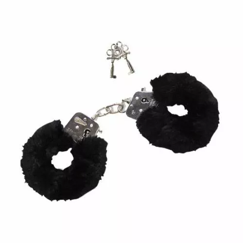 Metalen handboeien, met zacht pluche overtrokken om een aangenaam gevoel te behouden. Laat u zich eens lekker vast ketenen aan het bed of kast en maak kennis met het gevoel van macht en onmacht. Stalen handboeien met een korte verbindingsketting en 2 sleuteltjes. Nikkelvrij. Kleur zwart.