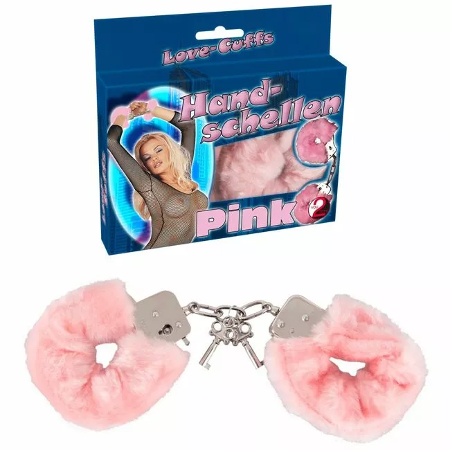 Metalen handboeien, met zacht pluche overtrokken om een aangenaam gevoel te behouden. Stalen handboeien met korte verbindingsketting en sleuteltjes.