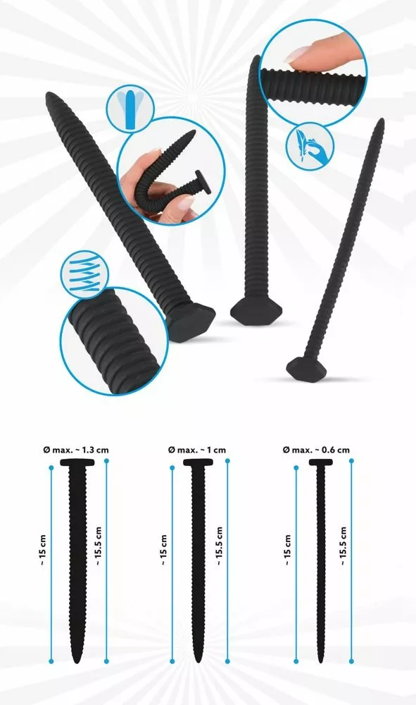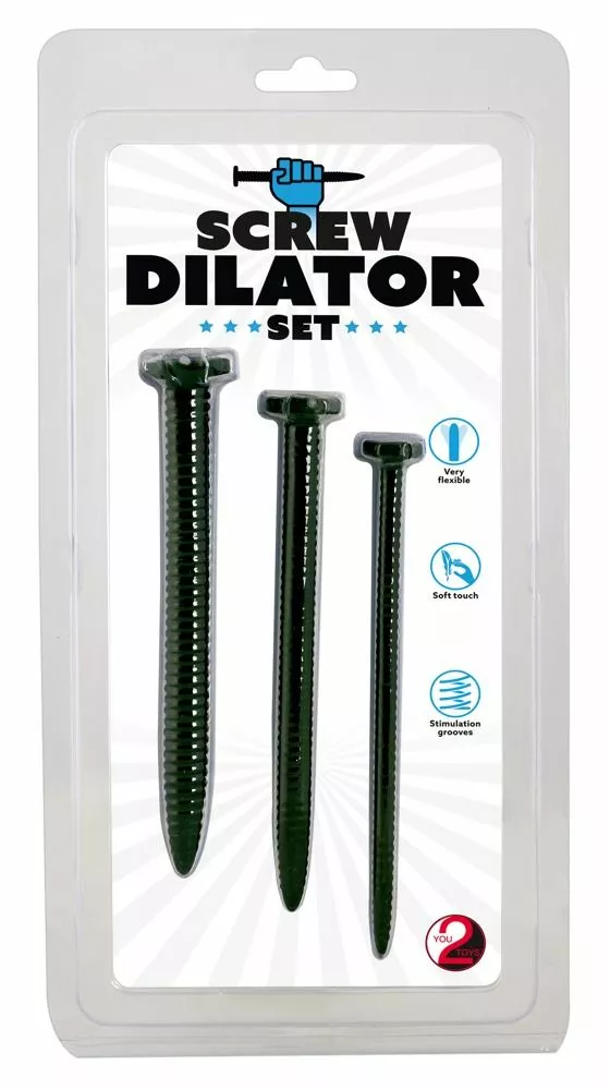 Voor de mannen die ervan houden om hun plasbuis te verwennen is de Screw Dilator Set – Zwart een uitstekende keuze. Deze set bestaat uit 3 dilators en hebben alle drie een verschillende diameter. Van 0.6 centimeter naar 1 centimeter tot 1.3 centimeter is het met deze set mogelijk om te trainen. Hierdoor is deze dilator set geschikt voo rervaren en beginnende gebruikers. De dilators hebben alle drie dezelfde lengte en een geribbelde schacht voor een intens gevoel bij het naar binnen brengen en een brede basis voor extra veiligheid. De Screw Dilator Set – Zwart van You2Toys hebben de vorm van een schroef voor een stoere look.
